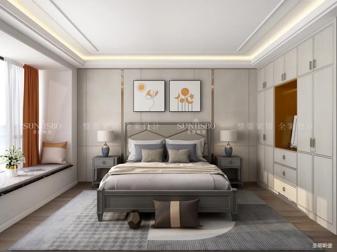 主卧随着优雅的金属线条铺开,卧室内的静谧感有序的传递着,带有温度的木饰面与温润的实木地板在同一空间交汇,充满轻奢质感。明亮橙的色彩点缀让空间活跃的格调不断扩充,仿古白的定制柜体在空间形成若隐若现的视觉平衡,将温暖,柔和组合成日常的睡眠氛围。